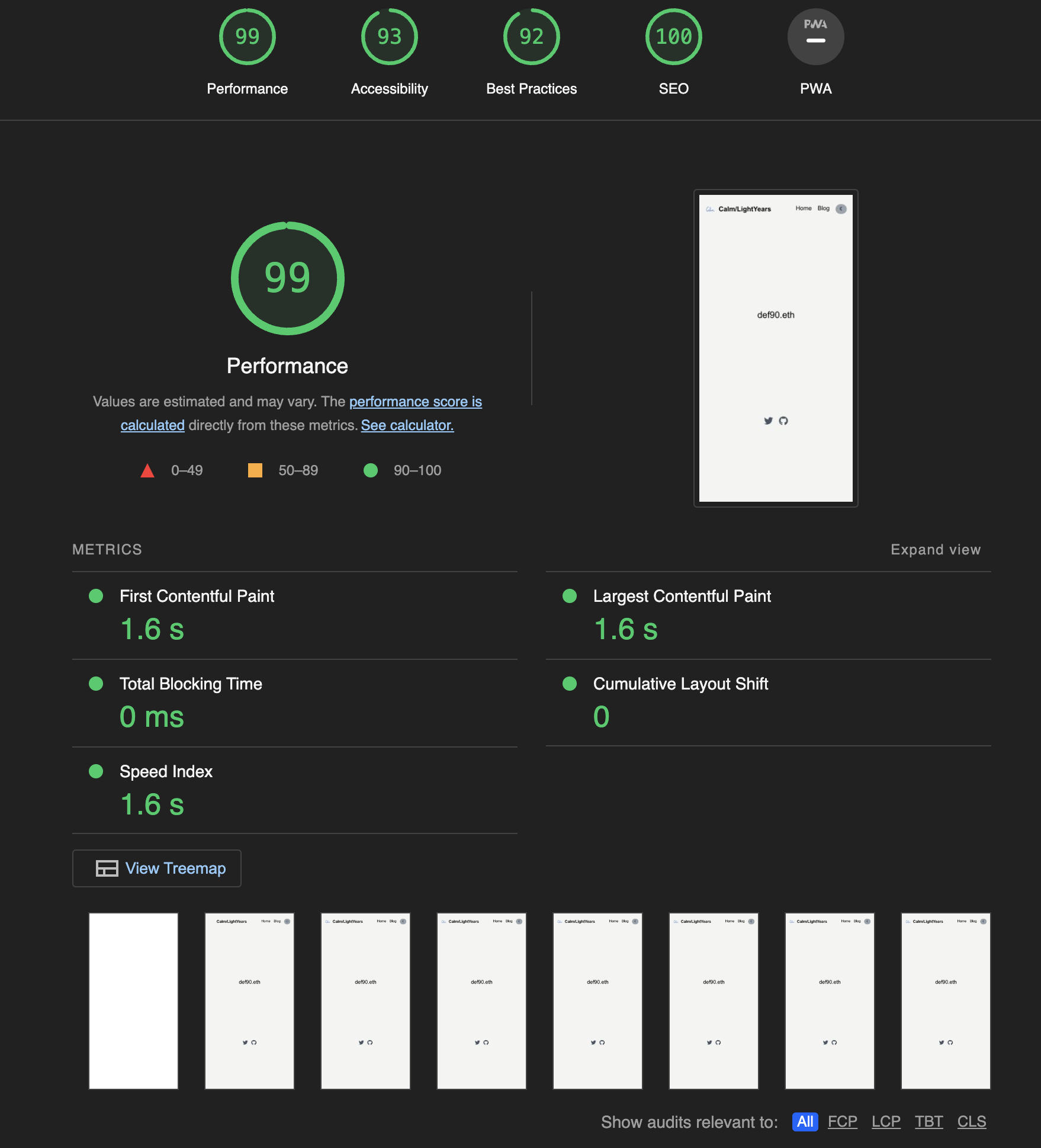 Lighthouseでレポートも作成してみましたが、割りといいスコアを出しています。今後、別のフレームワークを調査するときの比較対象として残しておきます。